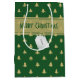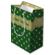 Denna grafiska design är en julgran ikon i guld som upprepas i förskjutna rader över en grön bakgrund för att skapa ett sömlöst ikoniskt julgransmönster. Mönstret är en rolig idé för presentinslagning av mindre presenter till din julfest.