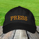 Hattar med brodermärke: Klassiskt golden/svart baseboll i mode med texten "PRESS" för media, reporter, journalist, fotografer, nyhetsskydd och klänning i party, högskoledagstidning, hemlig tomt/natt ut