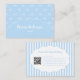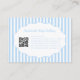 Trendy vintage-inspired blue and white bow stripes business card design, perfect for pretty, girly, feminine handmade baby clothing brands. Stylish layout with QR code integration, ideal for makeup artists, boutiques, and small business owners who want a charming, professional look.