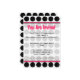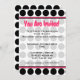 En inbjudan med svart-vit prickig bakgrund och varmröd trimning. Baksidan har en matchande rosa cirkelformad ram med texten "Du är välkommen.". Anpassa texten med detaljer om ditt evenemang.