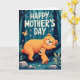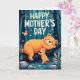 Korten är designat med en drömlik skogsscen och visar två vänliga björnliknande djur som delar en öm moment i en tyst skog ❤️. En större, kraftfull figur ligger på en tjock, mörk gren, med ett milt leende, röda kinder och en avspänd kroppshållning som känns varmt skyddande. Nedanför står en mindre unge på skogsbotten och sträcker sina små armar uppåt som om den ber om en kram eller försöker röra den ovanför. Figurerna är skuggade i ett mjukt orange sken som sticker ut mot djupt teal- och indigofärgade trädstammar och skuggiga blad, vilket ger scenen en mysig, undangömd känsla. Några små blommor i vitt och mjukt orange prickar de nedre områdena och tillför en söt, omtänksam touch 🌼. Nära toppen sitter ett kort morsdagsmeddelande centrerat i krämvit bokstavsstil, med orden placerade så att de andas mot den m