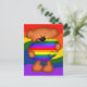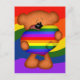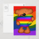 Ett litet vykort av en liten nalle som håller ett stort regnbåge av pridet