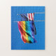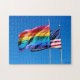 Ett vibrerande pussel med ett flagga för regnbåge med ett Pride för regnbåge, tillsammans med en amerikansk flagga, mot en perfekt blå himmel. Vi firar ett välkomnande, mångsidigt Amerika. Fotograferat på Cherry Grove på Fire Island. Del av Pridet Samling.
