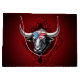 Pride och styrka, en amerikansk tjur med en flagga bandana. Tjuren har en slående vit ansikte, som är slående i sin detaljerade och verklighetstrogna beskrivning. Dess svarta näsa utgör en skarp kontrast till dess vita päls, medan dess långa vita horn stiga upp i stor utsträckning uppåt och ger djuret en stark närvaro. Tjuren bär en bandana med den amerikanska flagga över sitt ögon och bugar bilden med ett patriotiskt och stolt uttryck. Samspelet mellan realism och symbolisk design förmedlar styrka, mod och nationell solidaritet.