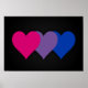 Poster med hjärtan i färg av bisexualitet; rosa, lila och blått pride i rand, flagga med regnbåge i kärlek på svart bakgrund