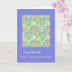 Ett födelsedagskort för söt från februari för ett steg Mor, med en mönster av djupa rosa, djupblåa och gult priroser, februari-månens blomma, från en handmålad design av Judy Adamson.