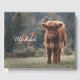 Fotografi av höstgräs i höstkalven fält. Den unga kalven av höstskotska nötkreatur på höstgrassi fält med muterat färg. Vackra orangar i mörk jackar kontrastera med lätt gräs i gult och träd i bakgrunden. Anpassningsbarnas anpassningsbara monogram med ditt namn och initalt på den lämnat.