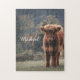Fotografi av höstgräs i höstkalven fält. Den unga kalven av höstskotska nötkreatur på höstgrassi fält med muterat färg. Vackra orangar i mörk jackar kontrastera med lätt gräs i gult och träd i bakgrunden. Anpassningsbarnas anpassningsbara monogram med ditt namn och initalt på den lämnat.