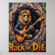 Den här övertygande teckningen ger en lejon, tittar coola i solglasögon och läder jacka och ger "prima strum" på ett gitarr från ett texturerat träd-ihåligt. Den naturliga skogen inslag ligger underligt ram i området, medan det framträdande budskapet "Sten eller Die" förstärker råenergin. Den tjocka, uttryckliga impaston skapar ett konkret struktur, skapar lejona passion för musik som verkligen resonerar