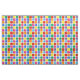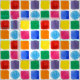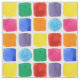 En färgstark väv som dekorerats med ett geometriskt mönster av fyrkanter och cirklar i en regnbåge av primärt färg, inklusive rött, grönt, orange, gult, blått, lila och rosa som målats i vattenfärg.