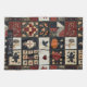 Den här kökshandduken har ett konstlappande estetiskt mönster som är placerat i ett rutnät med kvadratiska block som blandar både applicé och pieced inslag. Appliquéd-motiven omfattar en fet orange-pumpa, en svart kråka, röda hjärtan, kycklingar och stiliserade blommigtar, medan de pieced-block visar traditionell geometrisk quilt-mönster som stjärnor, diamanter och kor. Användan av djupa , krämer och mörkar/, accentuerade med mönstrade tyger som polka dots, blommigtar och texturerade fasta ämnen, skapar ett varmt och rustiskt stil. Perfekt för jordbruksgrödor, boende i land, primitiva hantverk och säsong-ympkilter, denna utformning ger uttryck för den traditionella karaktären av "quilting" med en mysigt, handgjord känsla.