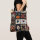 Den här väskan har ett konstlappande estetiskt mönster som ordnats i ett rutnät med kvadratiska block som blandar både applikqué och pieced inslag. Appliquéd-motiven omfattar en fet orange-pumpa, en svart kråka, röda hjärtan, kycklingar och stiliserade blommigtar, medan de pieced-block visar traditionell geometrisk quilt-mönster som stjärnor, diamanter och kor. Användan av djupa , krämer och mörkar/, accentuerade med mönstrade tyger som polka dots, blommigtar och texturerade fasta ämnen, skapar ett varmt och rustiskt stil. Perfekt för jordbruksgrödor, boende i land, primitiva hantverk och säsong-ympkilter, denna utformning ger uttryck för den traditionella karaktären av "quilting" med en mysigt, handgjord känsla.