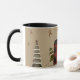Primitiv stil-kaffe mugg med laduröd saltbox kolonial. Snö ligger tak och toppar i träd. På ena sidan finns ett stort träd täckt av snö och på den andra sidan finns det ett snögubbe som tar emot posten. Se till att kontrollera min butik efter andra artiklar som koordinerar till ge ett primitivt primitivt och land titta på ditt kök!