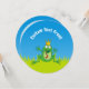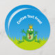 Prins groda tecknad med krona över grönt gräs under blå himmel.