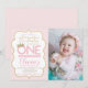 Redigera den här söta rosan och guld prinsessan 1:a födelsedagsinbjudan med egna uppgifter och foton