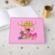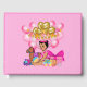 Illustration av en skön flicka som är klädd i rosa, med hår i knippen med rosa bows och princess tiara. Omringad av leksak och med rosa och guld-ballonger ovanför med stjärnor och måne. Cute-gåva för att kunna förvänta sig föräldrar, babydusch, gender eller baby födelsedagspresent.