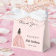 Ro guld, bakgrund, dekorerad med konetti och en flicka i en boll-klänning, klänning. Anpassa och lägg till namn och datum.