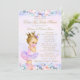 Prinsessans drive by baby shower-inbjudan med söt blond prinsessa som bär en mask och en söt rosa och lila tutu-dräkt och krona på en vacker rosa och lila blommig bakgrund. Denna söta tjej drive by baby shower kan enkelt anpassas för ditt evenemang genom att helt enkelt ändra texten. Du kan ändra textens färg, välja din typsnittsstil, formulering osv.