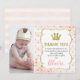 Söt prinsesskrona 1-års födelsedag tack-kort i rosa och guld. Detta kort är ett sött sätt att tacka din lilla enas gäster för att de kom till hennes fest. Designen har ett stort falskt guldglitter-ord, två rosa vattenfärgblomsterarrangemang, en ram och ett falskt guldglitter-prickmönster. Bakgrunden är ett avskalat vitt och svagt rosa randigt mönster. Ditt lilla flickas foto visas på vänster sida av kortet. Inbjudan med samma design finns också tillgänglig med eller utan foto i butiken. Detta prinsesskrona 1-års födelsedag tack-kort för flickor är redo att anpassas.