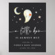 Welcome guests in spooky-cute style with this Halloween-themed baby shower sign from Redwood & Vine Design Co. The dark background features a smiling ghost, crescent moon, and twinkling stars surrounding the phrase “a little boo is almost due.” Whether printed or downloaded as a digital file, this sign adds festive charm to your October celebration. Customize with the honoree’s name and date for a personal touch. Perfect for entry tables, gift stations, or photo booth areas.