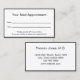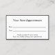 Doktor möte påminnelsekort i professionell är dubbla-sidigt. Båda sidor har en svart gräns. Sida ett säger "Ditt nästa Möte" och har linjer för datum och tid för det möte. I grund finns det visning som du kan redigera för att skapa ett anpassningsbar-meddelande om du vill. (Visas: Var vänlig och meddela 24 timmar i förväg om det inte går att behålla din möte.) Sida två har visning som ska ersättas med doktor namn (eller praktisera namn) och dess adress, mobila nummer och webbplats. All text kan redigeras eller tas bort. Texten är svart.
