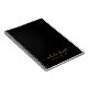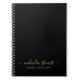 Professionell modern anteckningsbok med namn i modernt script-teckensnitt med anpassad text i modernt sans-serif-teckensnitt i guld på svart bakgrund.