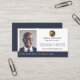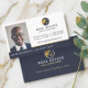 Modern och professionell verklig gods-affärskort med en fotoplatshållare som är inbyggd i designen för att visning ditt eget foto porträtt. Ren, minimal layoutdesign med snyggt marin och guld riktig logotyp i gods som du kan anpassa med ditt företag namn eller ta bort och ersätta med din egen logotyp. Namn och titeln visas på en framträdande plats längs grund i ett marint blått rand. Diskret faux guld-accenter ingår i designen för att lägga till en elegantens professionell. Anpassa till din kontaktinformation. Den omvända sidan har företagets logotyp och ytterligare kontaktinformation, t.ex. webbplatsen adress. Du kan ändra bakgrunden färg, teckensnitt, teckensnitt färg och layout till kostym om du vill. Logotypens utformning i den här designen är originalgrafik efter modell.