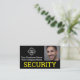 Det här affärskortet har en professionell med en "SECURITY"-titel som är tryckt i skarp gult över grund-delen över en svart bakgrund. Ett exempelskyddsfoto placeras på högerna som du kan anpassa för att inkludera ditt eget foto-ID. Ett företag eller en logotyp som ingår i urvalet placeras på den lämnat, följt av en anställd och ett företag namn. Säkerhetsföretaget eller den fasta informationen och kontaktinformationen placeras på baksidan.