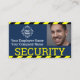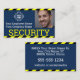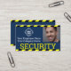 Det här affärskortet har en professionell med en "SECURITY"-titel utskriven i skarp gult över grund-delen över en marin blå bakgrund. Ett exempelskyddsfoto placeras på högerna som du kan anpassa för att inkludera ditt eget foto-ID. Ett företag eller en logotyp som ingår i urvalet placeras på den lämnat, följt av en anställd och ett företag namn. Säkerhetsföretaget eller den fasta informationen och kontaktinformationen placeras på baksidan. En ljus gult och en svart strimlad försiktighet tar bort gräns och grund.