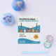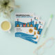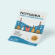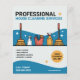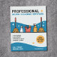 En professionell design för en flygblad om städtjänster i blå och gula toner, med illustrationer av städutrustning (kvastar, hink och sprutflaskor), ett specialerbjudande och stjärnor för att betona renlighet. Den innehåller en lista över tjänster och kan vara lämplig för aktiviteter som fönsterputsning eller städning, städning, hemstädning, hushållsarbete etc.