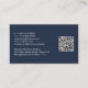 mörk blått affärskort med chicens professionell, med ditt namn framtill och mitt i fet, modern vit typografi och ditt yrke, din befattning eller ditt företag i ren vit typografi. På baksidan lägger du till din kontaktinformation och anger en URL-adress adress för att skapa en skannerbar QR-kod som är ansluten till din webbplats, portfölj, mediaprofil för social eller någon annan plattform som visar ditt arbete och som skapar det enkelt för kunder och kunder att utforska din expertis.