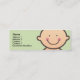 Denna gulliga smala profilerar kortet är det perfekta sociala åtfölja för dig och ditt barn! Dess slanka format tucks lätt bort i din blöja hänger lös, barnryggsäcken eller handväskan. Ideal för att dela ditt barns info, när det ordnar lek, daterar, sleepovers eller skapar precis nya vänner. Dessa gulliga kort presenterar en nyckfull illustration av en bebis ansikte framme av en grön bakgrund. Och bäst allra, profilerar varje kortet är fullständigt anpassadet. Starta att personifiera nu!