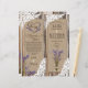 Rustiskt trä med vit snöre och blå lavenderblomma bouquet i Mason burk med brännvall, snöre och tvillingtrims över textbakgrund och hjärtklappning med monogrammet land stil bröllopsprogram.