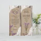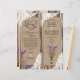 Rustiskt trä med vit snöre och lavenderblomma bouquet i Mason burk med brännvall, snöre och tvillingtrims över textbakgrunden och hjärtklappning med monogrammet land stil bröllopsprogram.
