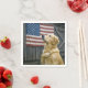 A golden retriever stands proudly in front of an American flag hanging on a rustic wooden barn
