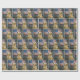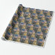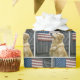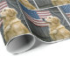 A golden retriever stands proudly in front of an American flag hanging on a rustic wooden barn