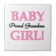 Proud Grandma of a Flicka keepébox, tiles, prydnadsföremål, anteckningsböcker, mugg, kort, klistermärken, tote bags, magnet, nyckelkedjor och andra stolta barnkläder och presentartiklar med rosa och svart text.
