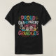 Bilden visar en nära bild av en svart t-shirt. Texten "PROUD" står överst i brev i rosa och gult. Under "PROUD" står "GRANDPARENT" i vitt. Under "GRANDPARENT" skall "OF FANTASTISK" i gult anges. Vid grund finns "BARNBARN" i färglöst, stiliserad brev. Mellan "OF FANTASTISK" och "BARNBARN" är tecknad teckning med fyra leende barn med olika hår färg.