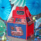 Proud Patriotic Farmer som kör en vintage, nostalgisk traktor mot en vättad amerikansk flagga att anpassa sig efter, anpassa sig genom att byta till ditt namn