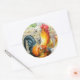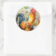 En barnyard tupp som är inramad av en avund av hans höns i dam och hö i mjuk fokus kring honom. De milda och grå färgen för in det färgstarka tupp i centrum för uppmärksamheten, höger där den stolta fågeln tycker om att vara. Det här är ett blandat medium teckning i oljepastel och färgpenna. Av Amanda Diehl, Paxdomino-design