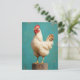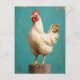 En charmerande, rustisk oljemålning med en stolt vit kyckling som står lång upp i en trästump i vätt. Den här teckningen utstrålar lantbrukarcharm och vintage mot en störd turkaiseringsbakgrund med tips på orange.