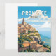 Provence retro vektor rese design. Provence är en historisk och kulturell region i sydöstra Frankrike. Känd för sina olika landskap, från södra Alperna och Camargue slätter till böljande vingårdar, olivlundar, tallskogar och lavendelfält.