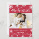 Gravid av julfotkort. Förväntar föräldrar! Modern, vit hand, skrev typografin "mer merrier"-skriptkort för att dina lycklig-nyheter med familj och vänner i julhelgen. En vacker vit snöflingor på röd bakgrund och en vågrät fotomall vid mitten. Vid baksidan av röd bakgrund med vit snöflingor. Du kan anpassa designen genom att ersätta exempeltexten och fotot. #3343 Kontakta mig om du behöver hjälp eller matchande artiklar.