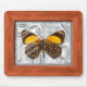 En tromp l'oeil-blick av en provlåda med satängfoder. En vacker fjäril sitter under glaset.