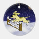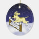 Den gulliga tecknadplatsen har en teckning av en hund som hoppar över ett snö täckt staket, med snö som faller i bakgrunden för natthimmel. Utmärkt prydnad för agilityhundjul!