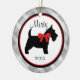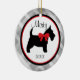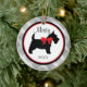 Cherish ditt husdjur, genom att sätta honom eller henne på din julgran! Denna julprydnad har en grå färggingham, cirklar rutig bakgrund med en centrera skisserat i rött och svart. Det finns en vit centrerar med en svart skotsk terrierhund med en röd pilbåge på dess nacke. Personifiera med namn och/eller år. Kontrollera ut de många andra designerna som vi har i vårt lager och annan diversehandel för: Kidsgalore och Skinsgalore