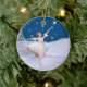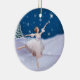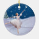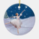 Denna älskvärda ballerina i henne dansen för dräkten för vitsnödrottningen i den fallande snön gör lite ett underbart att avbilda för denna julprydnad. Hon pekar in mot en stjärna i himmlen. Ett snö täckt träd ses i bakgrunden.