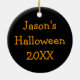 Prydnaden för rundan för den Halloween pojkespöken beklär plats för den särdragHalloween natten med en lutninggrönthimmel, en gul glödande måne bak en spöklik trädsilhouette & fladdermöss som omkring flyger. Centrera av platsen presenterar en gullig tecknadpojke i en spöke som dräkten med en bus eller godis hänger lös fullt av godisen som heading till ett spökat hus med ett vänligt spökeflyg över. Orangen stylized text är bus eller godis. Text är ställer in på baksidaen för att tillfoga ditt barns namn och för att datera. Perfekt minnessakgåva för Halloween!