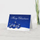 En modern julkort som presenterar prydnadar för blåttsnowflakejul på en snöbakgrund. Visat i blått och vit.