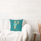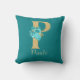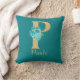 Fin prydnadskudde med bokstav 'P' i guldglitter med akvamarinfärgade rosor och en bukett guldblommor på tealbakgrund. Personliggör med namn i guldtypsnitt.
